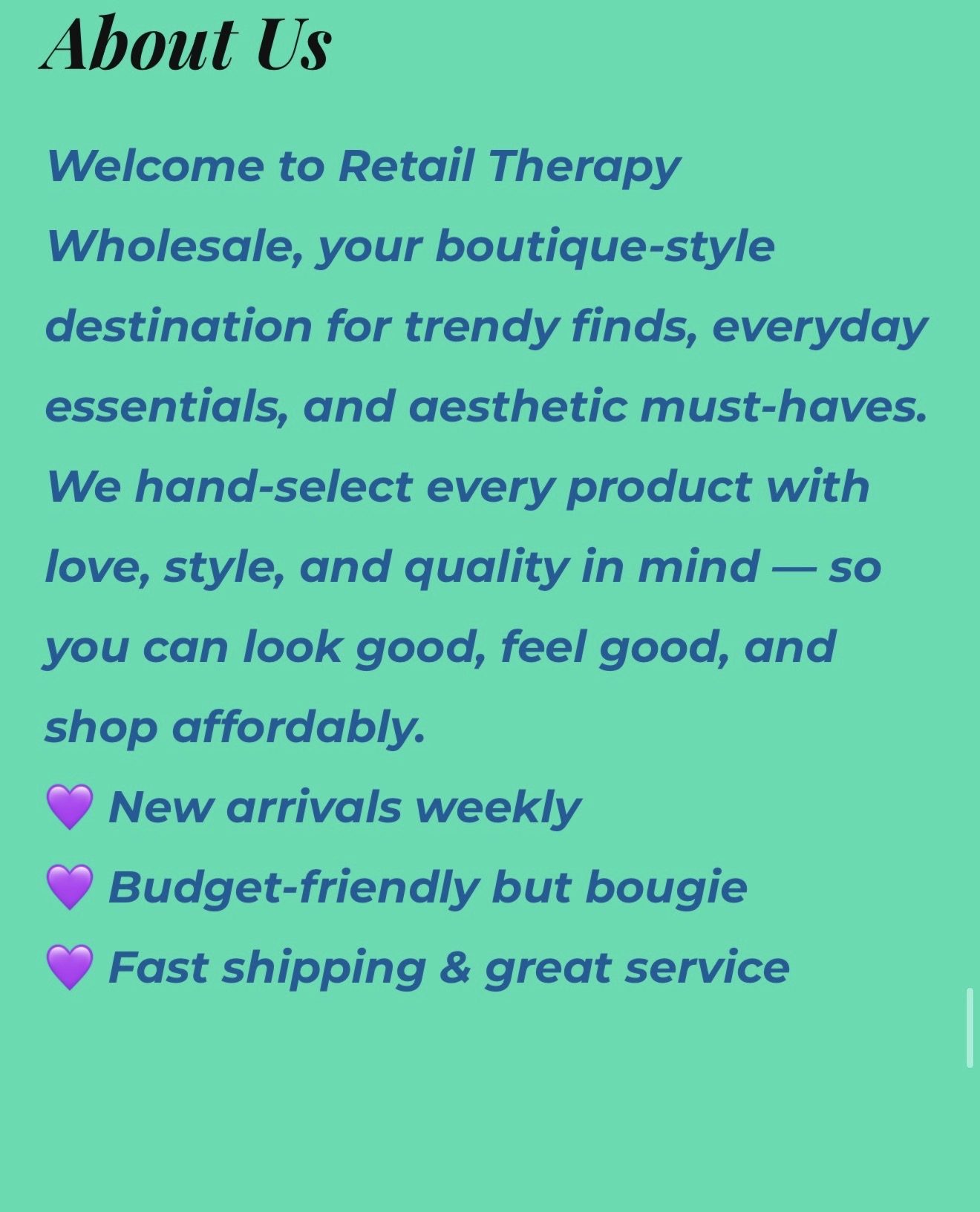 Retail Therapy Wholesale was founded to provide a friendly and approachable shopping experience with a vast selection of products. We believe everyone deserves access to quality items at great prices, backing our mission to be the trusted partner for savvy shoppers seeking value and choice.